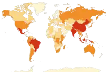 Parmi les Mammifères, les Placentaires sont les plus nombreux avec plus de 6 000 espèces regroupées dans 114 familles. Viennent en second les Marsupiaux qui comptent 270 espèces regroupées en seize familles, et seulement cinq espèces en deux familles pour les Monotrèmes. Ils sont présents sur l'ensemble de la Terre, dans tous les types de milieux terrestres. Chaque année, pour environ 10 000 nouvelles espèces animales découvertes, cinq à dix seulement sont des mammifères. Ce chiffre a considérablement augmenté, puisqu'on estime que durant la première décennie du XXIe siècle, ce sont plus de 300 nouvelles espèces qui ont été décrites[36]. Il faut voir là l'impact de l'outil génétique, qui permet de distinguer des espèces à l'apparence identique. Certains spécialistes pensent que 7 000 espèces sont encore inconnues, une partie d'entre elles étant menacées d'extinction[37].