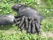 Comme le nom l'indique (mammifère signifie « qui porte des mamelles », du latin mamma « mamelle »[26]), les femelles de cette classe peuvent allaiter leur progéniture. Les glandes mammaires sont une évolution des glandes sudoripares qui donnent des champs mammaires chez les protothériens et de vraies mamelles chez les autres mammifères.