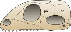 Crâne de synapside Légende : j : jugal ; p : pariétal ; po : postorbitaire ; q : carré ; qj : quadratojugal ; sq : squamosal.