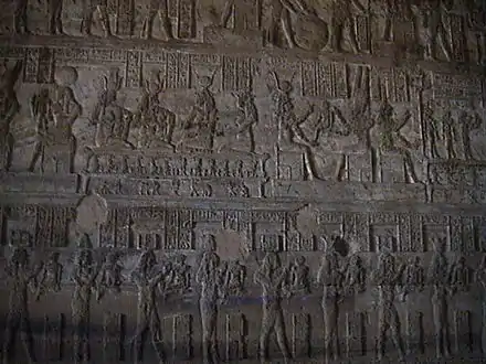 Les portiques qui entouraient le naos étaient constitués de colonnes à chapiteaux composites reliés entre eux par des murs bahuts ou murs d'entrecolonnement formant ainsi des panneaux illustrés où le souverain régnant sacrifiait et faisait offrande aux dieux.