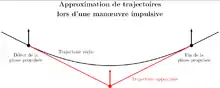 Bien qu’étant physiquement impossible due au caractère instantanée de l’impulsion, cette modélisation théorique décrit très bien les effets sur la trajectoire du véhicule spatial considéré. L’erreur de trajectoire, illustrée sur la figure ci-contre, est faible et suffisamment localisée pour être négligée à l’échelle de la trajectoire globale.