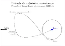 Une orbite de transfert à basse énergie est une trajectoire qui permet de réduire le delta-v de l’ordre de 10 à 25 % comparée avec les autres méthodes de transfert, mais nécessite bien plus de temps et une poussée longue et continue[4],[5]. C’est généralement la méthode utilisée dans le cas d’une propulsion électrique ou nucléaire.