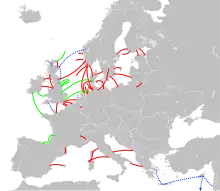 - Pierre Duval d'Abbeville, Description de la France et de ses provinces (Pierre Duval d'Abbeville et Nicolas Langlois, Paris, 1658), p. 43 : « La France eſtant comme au beau milieu de la Chreſtienté Elle regarde l’Eſpagne & la Mer Mediterranée vers le Midy : l’Ocean vers le Couchant : la Mer Britannique, vulgairement le Manche, qui la ſepare de l’Angleterre & les Pays-Bas vers le Septemtrion : & vers le Leuant la Lorraine, la Franche-Comté, la Sauoye & l’Italie ».