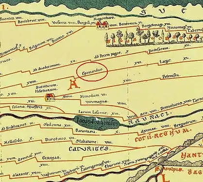 À l'époque romaine, Mandeure se nommait Epomanduodurum. Ce nom est mentionné pour la première fois dans l'Itinéraire d'Antonin (seconde moitié du IVe siècle)[17](p11). Epomanduodurum pourrait avoir une origine gauloise, et signifier « forteresse des petits chevaux » (de epo – attelage, mandu – petit cheval de trait, et durum – forteresse[19]). La table de Peutinger (copie du XIIIe siècle d'anciennes cartes romaines) mentionne Epomanduo.