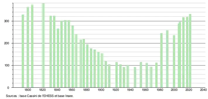 L'évolution du nombre d'habitants est connue à travers les recensements de la population effectués dans la commune depuis 1793. Pour les communes de moins de 10 000 habitants, une enquête de recensement portant sur toute la population est réalisée tous les cinq ans, les populations légales des années intermédiaires étant quant à elles estimées par interpolation ou extrapolation[17]. Pour la commune, le premier recensement exhaustif entrant dans le cadre du nouveau dispositif a été réalisé en 2007[18].