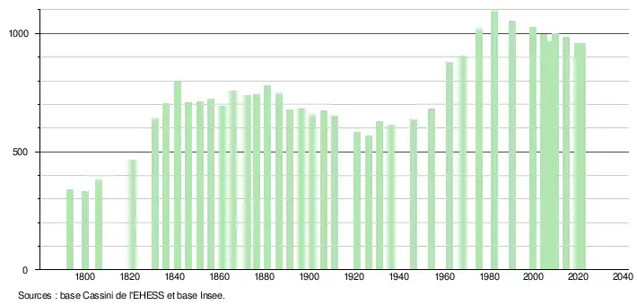 | L'évolution du nombre d'habitants est connue à travers les recensements de la population effectués dans la commune depuis 1793. Pour les communes de moins de 10 000 habitants, une enquête de recensement portant sur toute la population est réalisée tous les cinq ans, les populations légales des années intermédiaires étant quant à elles estimées par interpolation ou extrapolation[37]. Pour la commune, le premier recensement exhaustif entrant dans le cadre du nouveau dispositif a été réalisé en 2004[38]. En 2021, la commune comptait 959 habitants[Note 5], en diminution de 1,94 % par rapport à 2015 (Haute-Garonne : +7,43 %, France hors Mayotte : +1,84 %). |