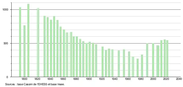 L'évolution du nombre d'habitants est connue à travers les recensements de la population effectués dans la commune depuis 1793. Pour les communes de moins de 10 000 habitants, une enquête de recensement portant sur toute la population est réalisée tous les cinq ans, les populations légales des années intermédiaires étant quant à elles estimées par interpolation ou extrapolation[20]. Pour la commune, le premier recensement exhaustif entrant dans le cadre du nouveau dispositif a été réalisé en 2007[21].