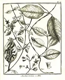 LA NACIBE à fleur rouge (PLANCHE 37. fig. 1)La racine de cette plante eſt fibreuſe & rameuſe : elle pouſſe à ſon ſommet des tiges, & des branches noueuſes, a quatre angles, d'où partent des rameaux longs, grêles, qui ſe répandent & ſe roulent de gauche à droite ſur les plantes, & ſur les arbriſſeaux voiſins.