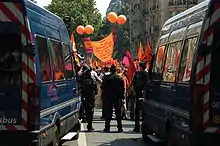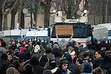 Intervenant souvent en fin de manifestation, le moment de la dispersion est crucial. Lorsque celle-ci n'intervient pas assez rapidement, en dépit des appels des organisateurs et des forces de l'ordre elles-mêmes, ces dernières ont toute latitude d'intervenir, que ce soit à l'aide de canons à eau[18], en chargeant ou à l'aide de grenades lacrymogènes. Lorsque les manifestants réagissent et contre-attaquent (en lançant divers projectiles, en renvoyant les grenades lacrymogènes, etc.), la manifestation peut alors tourner à l'émeute. Il arrive également que des manifestants décident d'eux-mêmes d'attaquer la police.