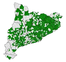 En vert, les villes où le « oui » a gagné aux référendums sur l'indépendance de la Catalogne.