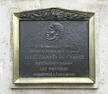 Une plaque commémorative est inaugurée le par le président de la République, René Coty : « Le devant la tombe de l'Inconnu les étudiants de France, manifestant en masse, les premiers résistèrent à l'occupant »[17]. Elle est située sur la façade de l'hôtel Landolfo-Carcano (actuelle ambassade du Qatar), au 156 avenue des Champs-Élysées, à l'angle avec la place de l'Étoile.