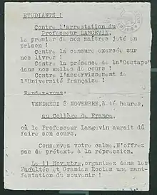 L'arrestation le de Paul Langevin, grande figure scientifique et professeur au Collège de France, est également considérée comme un des éléments déclencheurs de la manifestation. Une cinquantaine d’étudiants communistes parvient à manifester le aux abords du Collège de France, malgré les dispositifs répressifs français et allemands, pour dénoncer l’arrestation du professeur[2]. Les communistes décident de rallier la manifestation du 11 novembre seulement trois jours avant, car Maurice Berlemont, responsable au Parti communiste des Jeunesses communistes, avait initialement estimé que l’initiative, qui émanait d’« étudiants patriotes de la Faculté de droit », ne correspondait pas à la ligne souhaitée, avant de se rallier finalement à la manifestation, l’accord du parti n'étant ainsi obtenu que très tardivement[2].