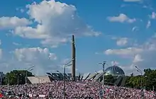 Le dimanche , à l'appel de Svetlana Tikhanovskaïa[40], se déroulent d'importantes manifestations d'opposition dans tout le pays, notamment 100 000 (selon l'AFP)[41] ou 200 000 personnes dans les rues de Minsk (d'après les estimations de Reuters)[42],[43], faisant suite à un meeting de Loukachenko devant quelques milliers de partisans acheminés par bus[44]. Loukachenko cherche par ailleurs à obtenir le soutien de Vladimir Poutine pour conserver son autorité[45]. Plus de 2 000 manifestants interpellés par la police sont libérés le [46].