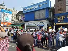 Le , un groupe d’instigateurs pro-militaires est arrivé sur un site de manifestation à Rangoun à bord de 15 véhicules banalisés, cherchant à provoquer la violence. Beaucoup ont brandi de grands clubs en bois et étaient autrement impossibles à distinguer des manifestants pro-démocratie.
