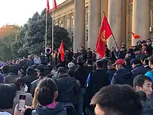 Au même moment, des manifestants libèrent de prison l'ancien Premier ministre Sapar Isakov[17] et un autre responsable politique, Sadyr Japarov, qui est rapidement désigné Premier ministre par intérim par le Parlement[18] après la démission du gouvernement de Koubatbek Boronov et du président du Parlement Dastan Jumabekov qui est, quant à lui, remplacé par Myktybek Abdyldaev[19]. L'ancien président Almazbek Atambaev est également libéré[20]. Les manifestations poussent alors les gouverneurs de Naryn[21], Talas[22], Tchouï[23], Yssykköl[24] et Bichkek[25] à la démission. Des gouverneurs d'opposition sont également nommés à Och[25] et dans la province homonyme[26].