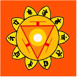 Maṇipūra est un lotus jaune à dix pétales. Le soleil, la force du feu est associé à ce chakra pour ses caractéristiques mais aussi pour la couleur. Un triangle équilatéral rouge pointé vers le bas est au centre de ce confluent énergétique. Un bélier est l'animal associé, symbole de la vitalité.