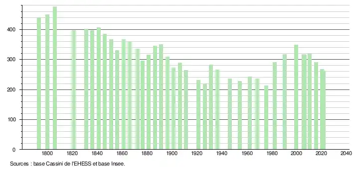 L'évolution du nombre d'habitants est connue à travers les recensements de la population effectués dans la commune depuis 1793. Pour les communes de moins de 10 000 habitants, une enquête de recensement portant sur toute la population est réalisée tous les cinq ans, les populations légales des années intermédiaires étant quant à elles estimées par interpolation ou extrapolation[20]. Pour la commune, le premier recensement exhaustif entrant dans le cadre du nouveau dispositif a été réalisé en 2005[21].
