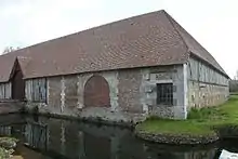 Les communs, placés en avant-cour[1], sont d'anciennes écuries[3]. Également entourés de douves, ils présentent des façades constituées par un soubassement fait de moellons, de briques et de pierres de taille, et par des élévations en pans de bois[1]. L'accès à la cour centrale se fait par un vaste porche construit dans ces communs.
