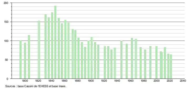L'évolution du nombre d'habitants est connue à travers les recensements de la population effectués dans la commune depuis 1793. Pour les communes de moins de 10 000 habitants, une enquête de recensement portant sur toute la population est réalisée tous les cinq ans, les populations légales des années intermédiaires étant quant à elles estimées par interpolation ou extrapolation[31]. Pour la commune, le premier recensement exhaustif entrant dans le cadre du nouveau dispositif a été réalisé en 2007[32].