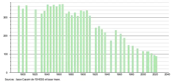L'évolution du nombre d'habitants est connue à travers les recensements de la population effectués dans la commune depuis 1793. Pour les communes de moins de 10 000 habitants, une enquête de recensement portant sur toute la population est réalisée tous les cinq ans, les populations légales des années intermédiaires étant quant à elles estimées par interpolation ou extrapolation[18]. Pour la commune, le premier recensement exhaustif entrant dans le cadre du nouveau dispositif a été réalisé en 2008[19].