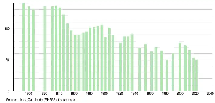 L'évolution du nombre d'habitants est connue à travers les recensements de la population effectués dans la commune depuis 1793. Pour les communes de moins de 10 000 habitants, une enquête de recensement portant sur toute la population est réalisée tous les cinq ans, les populations légales des années intermédiaires étant quant à elles estimées par interpolation ou extrapolation[19]. Pour la commune, le premier recensement exhaustif entrant dans le cadre du nouveau dispositif a été réalisé en 2007[20].