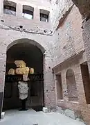 Au premier étage, le mur est percé d'une série de fenêtres voûtées (à raison de cinq fenêtres pour trois boutiques du rez-de-chaussée) entourées de piliers de briques avec bases et chapiteaux et surmontées de petits frontons. Elles s'ouvrent sur un couloir voûté passant au-dessus des boutiques qui dessert à l'intérieur dix autres boutiques. Il s'étend vers le nord, conduisant à un autre couloir flanqué d'un groupe de boutiques.