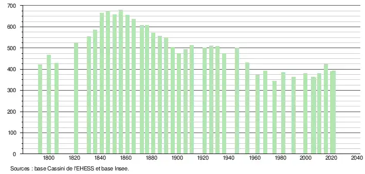 L'évolution du nombre d'habitants est connue à travers les recensements de la population effectués dans la commune depuis 1793. Pour les communes de moins de 10 000 habitants, une enquête de recensement portant sur toute la population est réalisée tous les cinq ans, les populations légales des années intermédiaires étant quant à elles estimées par interpolation ou extrapolation[21]. Pour la commune, le premier recensement exhaustif entrant dans le cadre du nouveau dispositif a été réalisé en 2005[22].