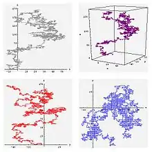 La galerie ci-dessous contient quatre spécimens de marches aléatoires isotropes sur le réseau ℤ3 après 10 000 pas, partant de l'origine.