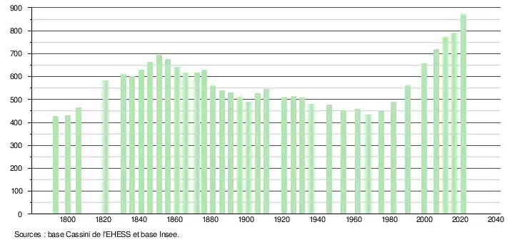 L'évolution du nombre d'habitants est connue à travers les recensements de la population effectués dans la commune depuis 1793. Pour les communes de moins de 10 000 habitants, une enquête de recensement portant sur toute la population est réalisée tous les cinq ans, les populations légales des années intermédiaires étant quant à elles estimées par interpolation ou extrapolation[19]. Pour la commune, le premier recensement exhaustif entrant dans le cadre du nouveau dispositif a été réalisé en 2006[20].