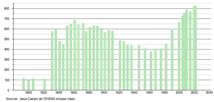 L'évolution du nombre d'habitants est connue à travers les recensements de la population effectués dans la commune depuis 1793. Pour les communes de moins de 10 000 habitants, une enquête de recensement portant sur toute la population est réalisée tous les cinq ans, les populations légales des années intermédiaires étant quant à elles estimées par interpolation ou extrapolation[47]. Pour la commune, le premier recensement exhaustif entrant dans le cadre du nouveau dispositif a été réalisé en 2004[48].