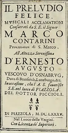 - (it) Francesco Maria Piccioli, Marco Contarini et Domenico Freschi, Il prelvdio felice : mvsicali acclamationi consacrati da S.E. il signor Marco Contarini, procurator di S. Marco, all' Altezza Serenissima d'Ernesto Avgvsto, vescovo d'Osnabrvg, duca di Bransuich, Luneburgo, &c. : in occasione, che l' A.S. fauorisce S.E. nel luoco di Piazzola [« L'heureux prélude : acclamations musicales consacrées par S.E. le seigneur Marco Contarini, procurateur de S. Marco, à l'Altesse Sérénissime Ernest Auguste, évêque d'Osnabrück, duc de Brunswick, Lunebourg, &c. : à l'occasion, que l'A.S. favorise S.E. dans le lieu de Piazzola »], Piazzola, Nel luoco delle vergini, (lire en ligne).