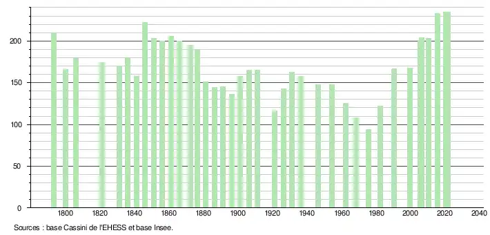 L'évolution du nombre d'habitants est connue à travers les recensements de la population effectués dans la commune depuis 1793. Pour les communes de moins de 10 000 habitants, une enquête de recensement portant sur toute la population est réalisée tous les cinq ans, les populations légales des années intermédiaires étant quant à elles estimées par interpolation ou extrapolation[17]. Pour la commune, le premier recensement exhaustif entrant dans le cadre du nouveau dispositif a été réalisé en 2005[18].