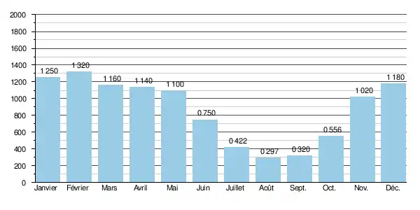 À l'étiage le VCN3 peut ainsi chuter jusque 0,056 m3/s, en cas de période quinquennale sèche, soit 56 litres par seconde[2], ce qui peut être considéré comme assez sévère ou 6,4 % du module 0,874 m3/s.
