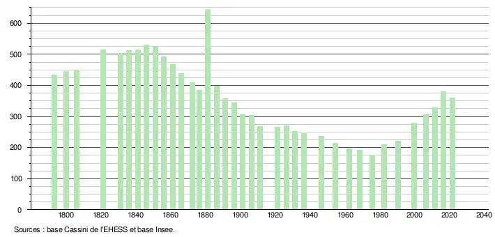 L'évolution du nombre d'habitants est connue à travers les recensements de la population effectués dans la commune depuis 1793. Pour les communes de moins de 10 000 habitants, une enquête de recensement portant sur toute la population est réalisée tous les cinq ans, les populations légales des années intermédiaires étant quant à elles estimées par interpolation ou extrapolation[21]. Pour la commune, le premier recensement exhaustif entrant dans le cadre du nouveau dispositif a été réalisé en 2006[22].