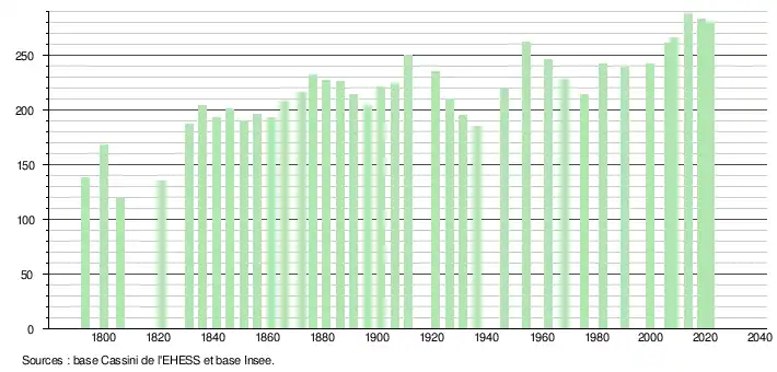 L'évolution du nombre d'habitants est connue à travers les recensements de la population effectués dans la commune depuis 1793. Pour les communes de moins de 10 000 habitants, une enquête de recensement portant sur toute la population est réalisée tous les cinq ans, les populations légales des années intermédiaires étant quant à elles estimées par interpolation ou extrapolation[33]. Pour la commune, le premier recensement exhaustif entrant dans le cadre du nouveau dispositif a été réalisé en 2008[34].
