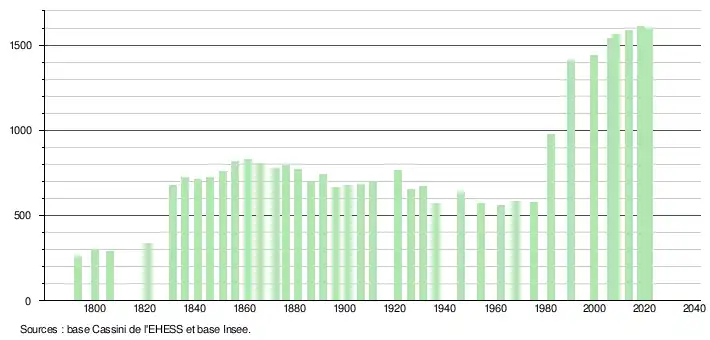 L'évolution du nombre d'habitants est connue à travers les recensements de la population effectués dans la commune depuis 1793. Pour les communes de moins de 10 000 habitants, une enquête de recensement portant sur toute la population est réalisée tous les cinq ans, les populations légales des années intermédiaires étant quant à elles estimées par interpolation ou extrapolation[20]. Pour la commune, le premier recensement exhaustif entrant dans le cadre du nouveau dispositif a été réalisé en 2008[21].