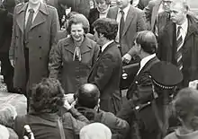 Edward Heath remet son poste de chef du Parti conservateur en jeu. Initialement candidat, Keith Joseph se retire à la suite d'une « gaffe » dans un discours[alpha 3],[59],[3]. Margaret Thatcher décide alors de se présenter. Le , après avoir méthodiquement mené campagne auprès des députés, avec le soutien d'Airey Neave, elle obtient 130 voix et, à la surprise générale[alpha 4], devance Edward Heath (119 voix), qui annonce aussitôt son retrait[5]. Le Daily Mail écrit que « le mot « sensationnel » est à peine adéquat pour décrire l'onde de choc qui secoua Westminster après l'annonce des résultats »[60]. Au second tour, elle recueille 146 voix contre 79 à William Whitelaw[61]. Elle prend la tête du parti le [62].