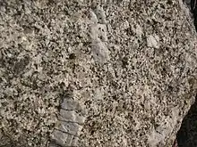 La roche prédominante en Margeride est un granite porphyroïde (c'est-à-dire incorporant de grands cristaux de feldspath potassique). Ces cristaux d'orthose systématiquement maclés (macle de Carlsbad) peuvent atteindre 10 cm de long : c'est la raison pour laquelle on parle parfois de granite à « dents de cheval »[8]. Du point de vue pétrographique, il s'agit d'un granite calco-alcalin à biotite, dans lequel s'individualisent des porphyroblastes de feldspath potassique et des nids décimétriques à demi-métriques de feldspaths potassiques accompagnés de schorl[9].