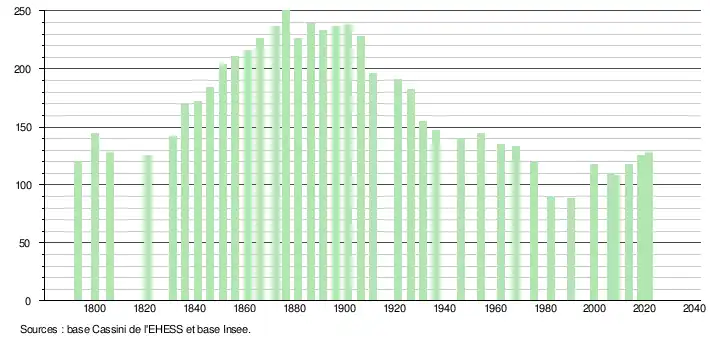 L'évolution du nombre d'habitants est connue à travers les recensements de la population effectués dans la commune depuis 1793. Pour les communes de moins de 10 000 habitants, une enquête de recensement portant sur toute la population est réalisée tous les cinq ans, les populations légales des années intermédiaires étant quant à elles estimées par interpolation ou extrapolation[11]. Pour la commune, le premier recensement exhaustif entrant dans le cadre du nouveau dispositif a été réalisé en 2008[12].