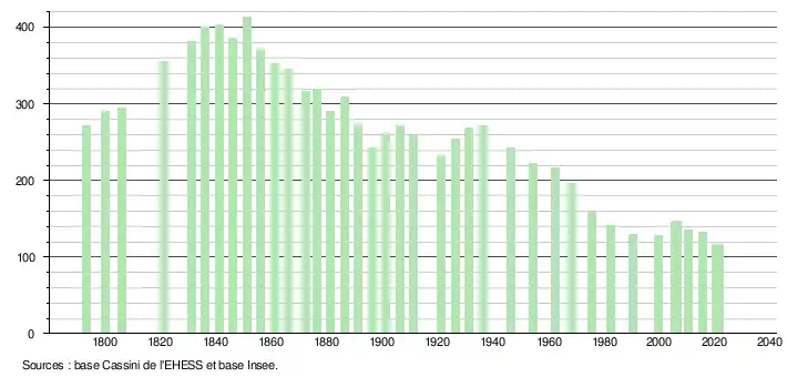 L'évolution du nombre d'habitants est connue à travers les recensements de la population effectués dans la commune depuis 1793. Pour les communes de moins de 10 000 habitants, une enquête de recensement portant sur toute la population est réalisée tous les cinq ans, les populations légales des années intermédiaires étant quant à elles estimées par interpolation ou extrapolation[24]. Pour la commune, le premier recensement exhaustif entrant dans le cadre du nouveau dispositif a été réalisé en 2005[25].
