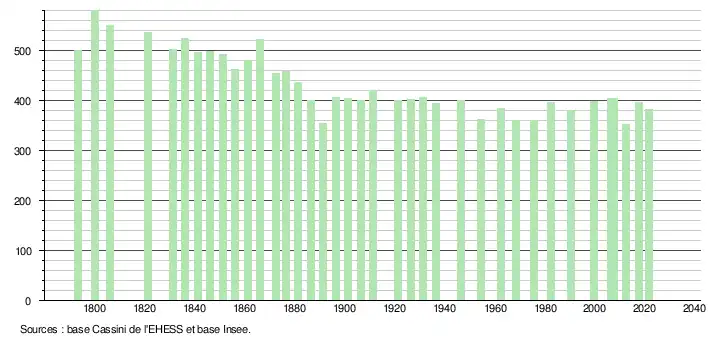 L'évolution du nombre d'habitants est connue à travers les recensements de la population effectués dans la commune depuis 1793. Pour les communes de moins de 10 000 habitants, une enquête de recensement portant sur toute la population est réalisée tous les cinq ans, les populations légales des années intermédiaires étant quant à elles estimées par interpolation ou extrapolation[23]. Pour la commune, le premier recensement exhaustif entrant dans le cadre du nouveau dispositif a été réalisé en 2007[24].