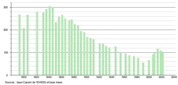 | L'évolution du nombre d'habitants est connue à travers les recensements de la population effectués dans la commune depuis 1793. Pour les communes de moins de 10 000 habitants, une enquête de recensement portant sur toute la population est réalisée tous les cinq ans, les populations légales des années intermédiaires étant quant à elles estimées par interpolation ou extrapolation[30]. Pour la commune, le premier recensement exhaustif entrant dans le cadre du nouveau dispositif a été réalisé en 2008[31]. En 2021, la commune comptait 103 habitants[Note 7], en diminution de 11,21 % par rapport à 2015 (Tarn-et-Garonne : +3,17 %, France hors Mayotte : +1,84 %). |