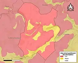Les mouvements de terrains susceptibles de se produire sur la commune sont des tassements différentiels[18]. Le retrait-gonflement des sols argileux est susceptible d'engendrer des dommages importants aux bâtiments en cas d’alternance de périodes de sécheresse et de pluie[19]. La totalité de la commune est en aléa moyen ou fort (79,5 % au niveau départemental et 48,5 % au niveau national)[Carte 2]. Depuis le , en application de la loi ÉLAN, différentes contraintes s'imposent aux vendeurs, maîtres d'ouvrages ou constructeurs de biens situés dans une zone classée en aléa moyen ou fort[Note 3],[20].