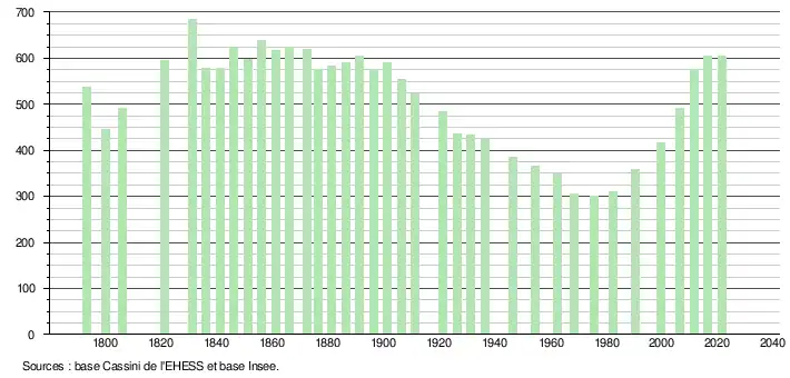 L'évolution du nombre d'habitants est connue à travers les recensements de la population effectués dans la commune depuis 1793. Pour les communes de moins de 10 000 habitants, une enquête de recensement portant sur toute la population est réalisée tous les cinq ans, les populations légales des années intermédiaires étant quant à elles estimées par interpolation ou extrapolation[25]. Pour la commune, le premier recensement exhaustif entrant dans le cadre du nouveau dispositif a été réalisé en 2006[26].