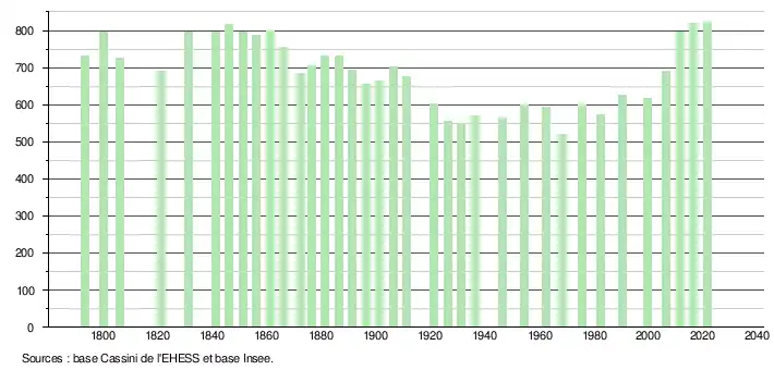 L'évolution du nombre d'habitants est connue à travers les recensements de la population effectués dans la commune depuis 1793. Pour les communes de moins de 10 000 habitants, une enquête de recensement portant sur toute la population est réalisée tous les cinq ans, les populations légales des années intermédiaires étant quant à elles estimées par interpolation ou extrapolation[33]. Pour la commune, le premier recensement exhaustif entrant dans le cadre du nouveau dispositif a été réalisé en 2006[34].