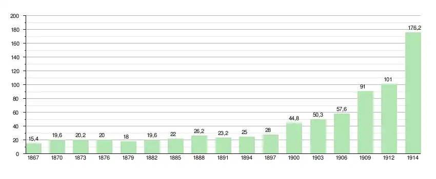 Sous la pression d'une partie du Haut Commandement naval, Sterneck se détache de cette doctrine dans les années 1890 et met en chantier des croiseurs cuirassés. Ses successeurs von Spaun et Monteccucoli poursuivent l'effort de construction navale grâce à une hausse significative du budget consacré à la marine, en obtenant l'appui de l'archiduc François-Ferdinand, Kronprinz impérial et royal. C'est l'époque où l'État devient pratiquement autonome pour la construction navale (chantiers navals de Trieste et Fiume, Usines Škoda pour l'armement et le blindage). La crise bosniaque montre également la nécessité de disposer d'une marine puissante. Commence alors une compétition entre l'Autriche-Hongrie et l'Italie, en dépit de l'adhésion des deux pays à la Triplice. L'association des marines des deux pays, confortée par une flottille allemande, vise à contester le contrôle de la Méditerranée par la Triple-Entente. C'est l'objet de la convention navale de entre l'Italie et l'Autriche-Hongrie[73]. Mais l'accord n'est pas dénué d'arrière-pensées en raison des revendications irrédentistes italiennes sur l'Istrie, la Dalmatie et le Tyrol.