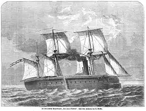 Les Italiens se lancèrent rapidement dans un programme d'expansion de la Regia Marina, croyant fermement qu'une marine forte leur assurerait le statut de grande puissance. L'Autriche, qui n'avait aucune intention de reconnaître l'établissement du royaume d'Italie, ne pouvait ignorer la menace navale italienne. Dès la fin de l'année 1860, Ferdinand Max avait personnellement ordonné la construction de deux premiers cuirassés à coque en fer de classe Drache de la marine impériale autrichienne[64]. Ces vaisseaux, les SMS Drache et le SMS Salamander, étaient construits à Trieste par les chantiers navals Stabilimento Tecnico Triestino. En parallèle, l'archiduc s'employa à réunir les fonds nécessaires à la poursuite du programme. En avril 1861, il proposa à son frère François-Joseph Ier un large programme de construction pour une flotte de neuf cuirassés à coque en fer, ainsi que sept vaisseaux de guerre supplémentaires. De plus, Ferdinand Max y voyait l'occasion de remplacer progressivement les traditionnels vaisseaux en bois, rendus obsolètes par les cuirassés plus modernes[65]. D'après lui, si les Autrichiens parvenaient à construire sept cuirassés supplémentaires en 1863, la puissance de la Kriegsmarine équivaudrait au tiers de la marine française, alors considérée comme une des plus puissantes du monde. Un tel gain de puissance serait bénéfique pour la diplomatie autrichienne, et contribuerait à sortir l'Empire de son isolement auprès des autres puissances européennes depuis la guerre de Crimée[66].