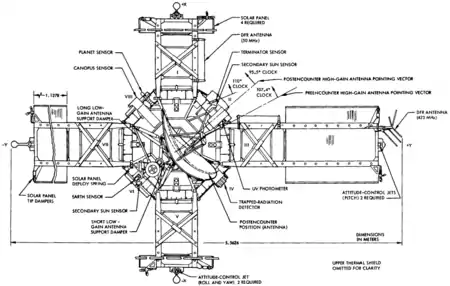 Quatre panneaux solaires et une antenne parabolique à gain élevé de 116,8 cm de diamètre sont fixés au sommet de la plate-forme. Une antenne omnidirectionnelle à faible gain et le magnétomètre sont montés sur un mât de 223,5 cm de hauteur à côté de l'antenne à gain élevé. La hauteur totale de la sonde spatiale est de 289 cm.