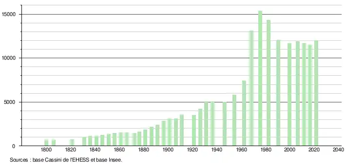 - Par convention dans Wikipédia, le principe a été retenu de n’afficher dans le tableau des recensements et le graphique, pour les populations légales postérieures à 1999, que les populations correspondant à une enquête exhaustive de recensement pour les communes de moins de 10 000 habitants, et que les populations des années 2006, 2011, 2016, etc. pour les communes de plus de 10 000 habitants, ainsi que la dernière population légale publiée par l’Insee pour l'ensemble des communes.