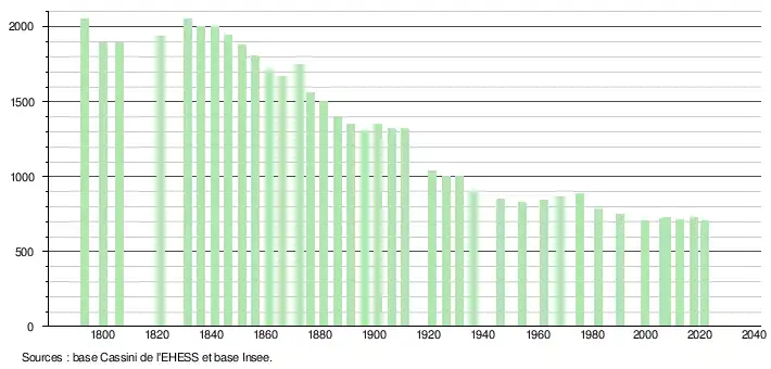 L'évolution du nombre d'habitants est connue à travers les recensements de la population effectués dans la commune depuis 1793. Pour les communes de moins de 10 000 habitants, une enquête de recensement portant sur toute la population est réalisée tous les cinq ans, les populations légales des années intermédiaires étant quant à elles estimées par interpolation ou extrapolation[11]. Pour la commune, le premier recensement exhaustif entrant dans le cadre du nouveau dispositif a été réalisé en 2007[12].